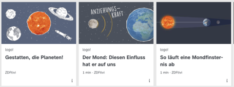 - Videosammlung logo!: Weltall und Raumfahrt. In sehr kurzen Videos (1 Min.) werden aktuell astronomische Themen aufgegriffen und kindgerecht erläutert.